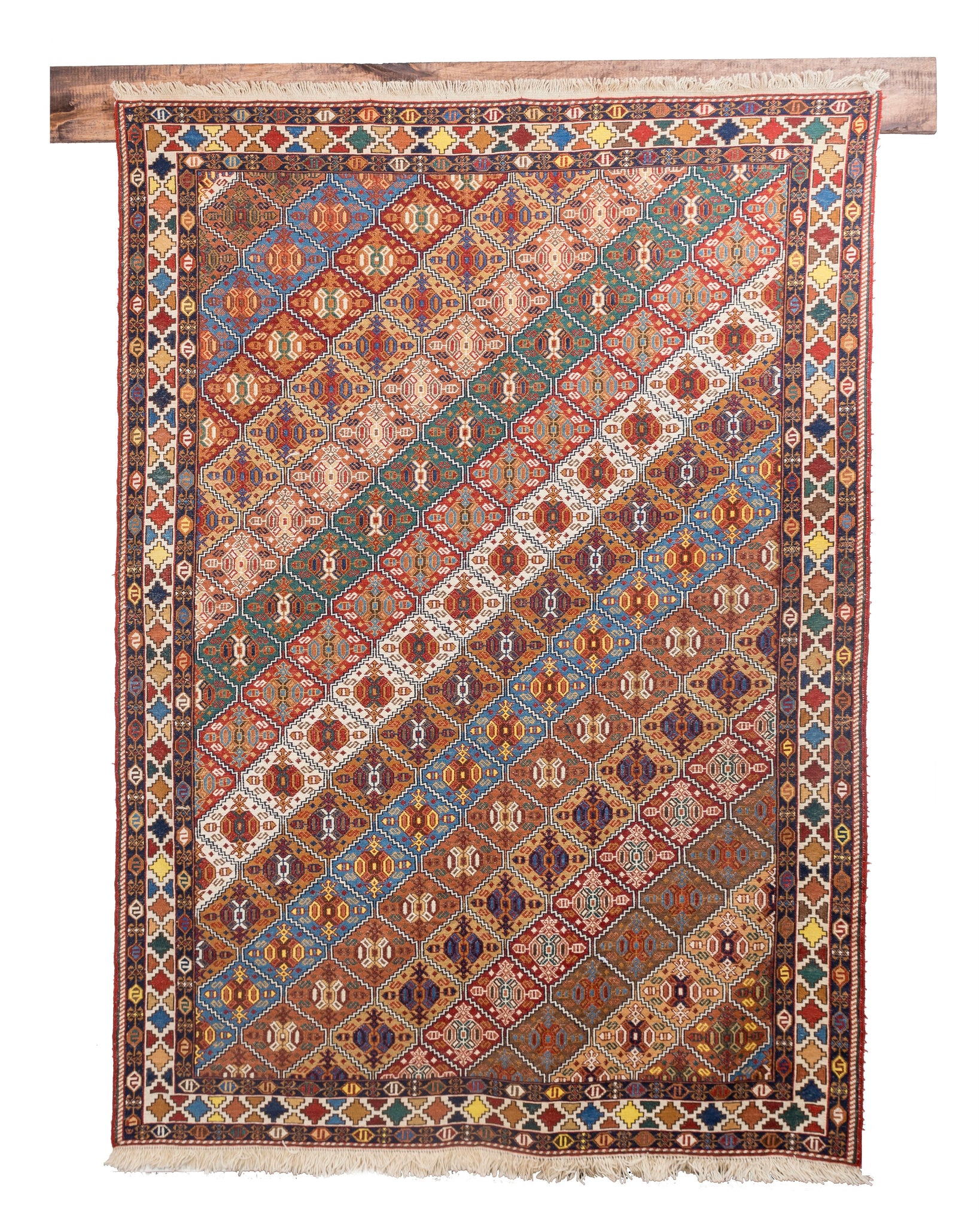 This hand-knotted wool rug is a pile less tapestry woven rug with bright and warm colours that brings a homey welcoming feeling to your house.